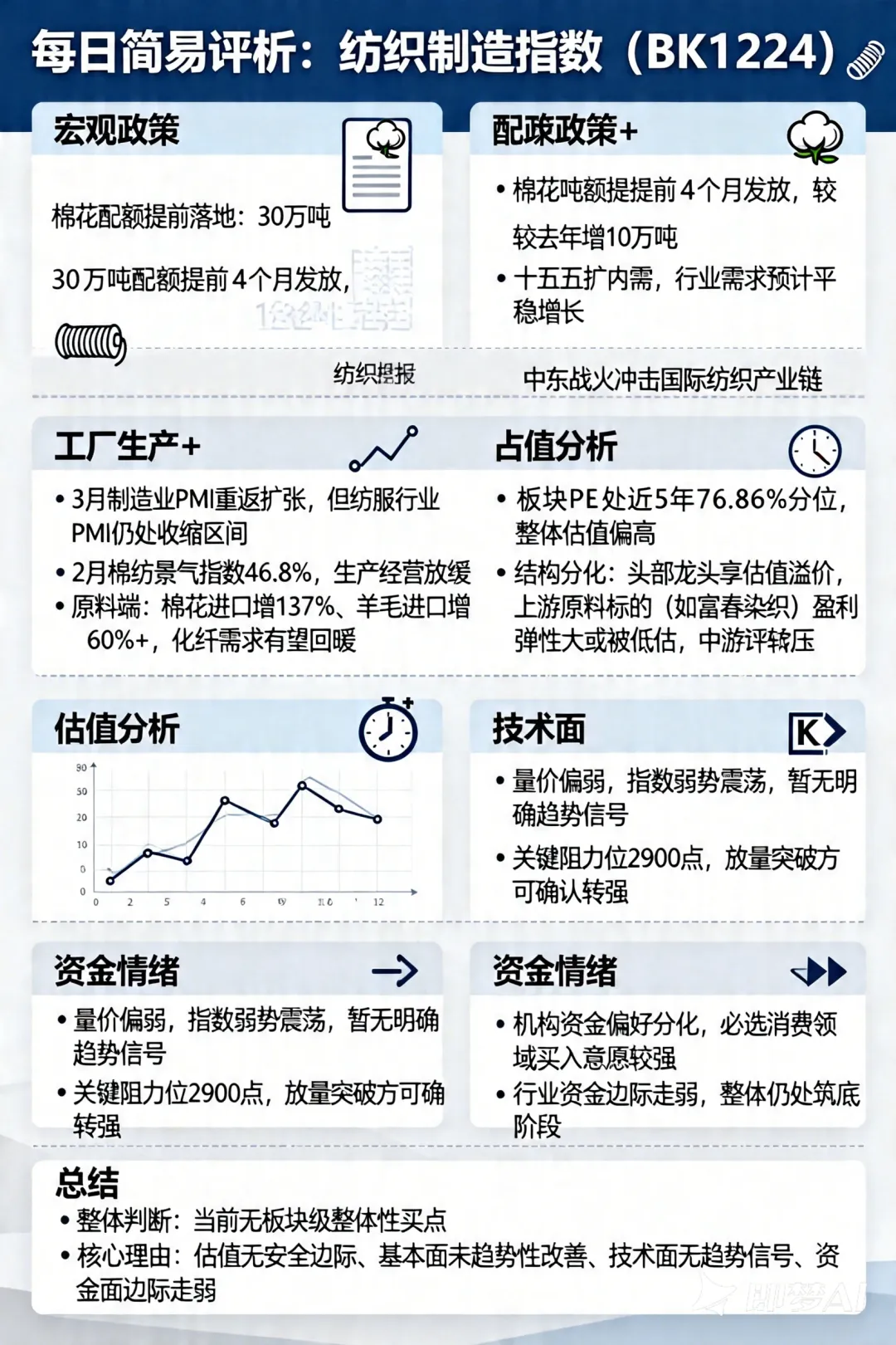 基本面:2026年3月,制造业PMI回升至50.4%,重返扩张区间,但纺织服装服饰行业的生产指数和新订单指数继续低于临界点,市场活跃度偏弱。2月中国棉纺织景气指数为46.8%,较1月下降3.6个百分点,生产经营放缓。