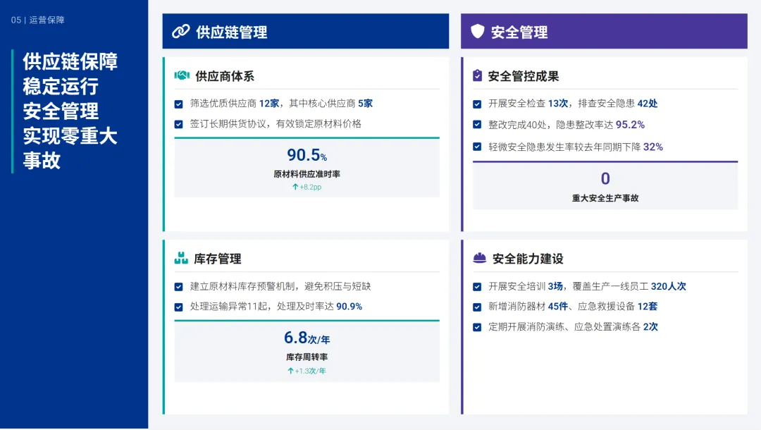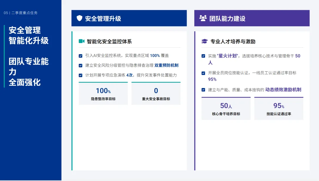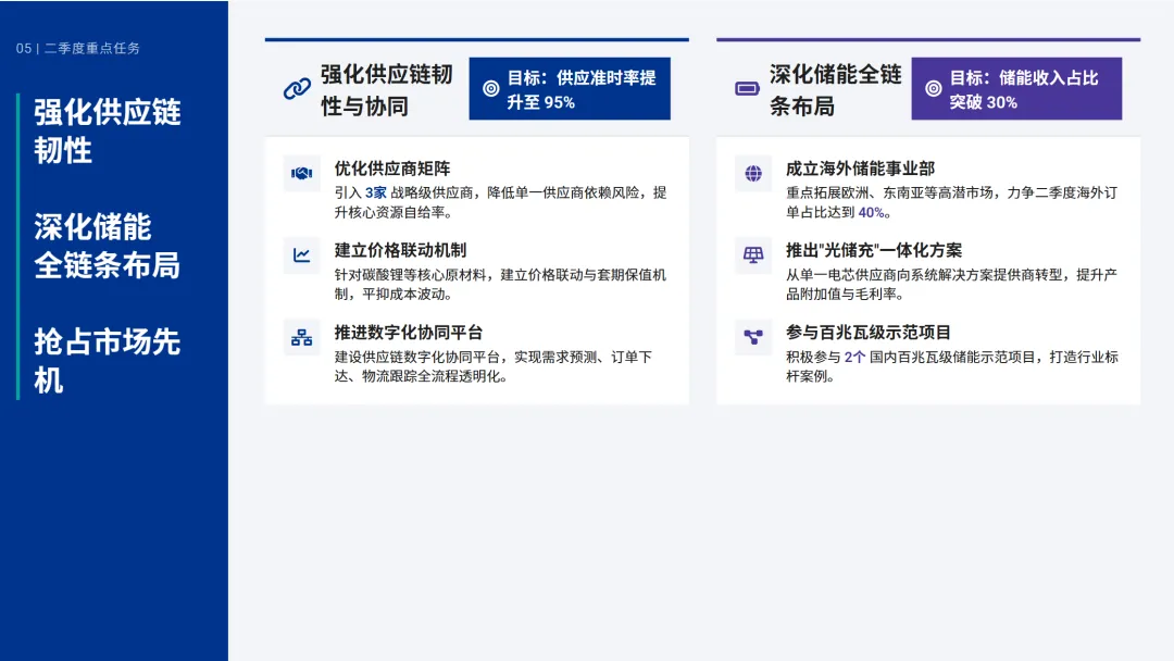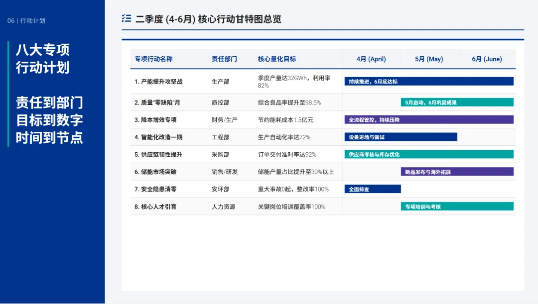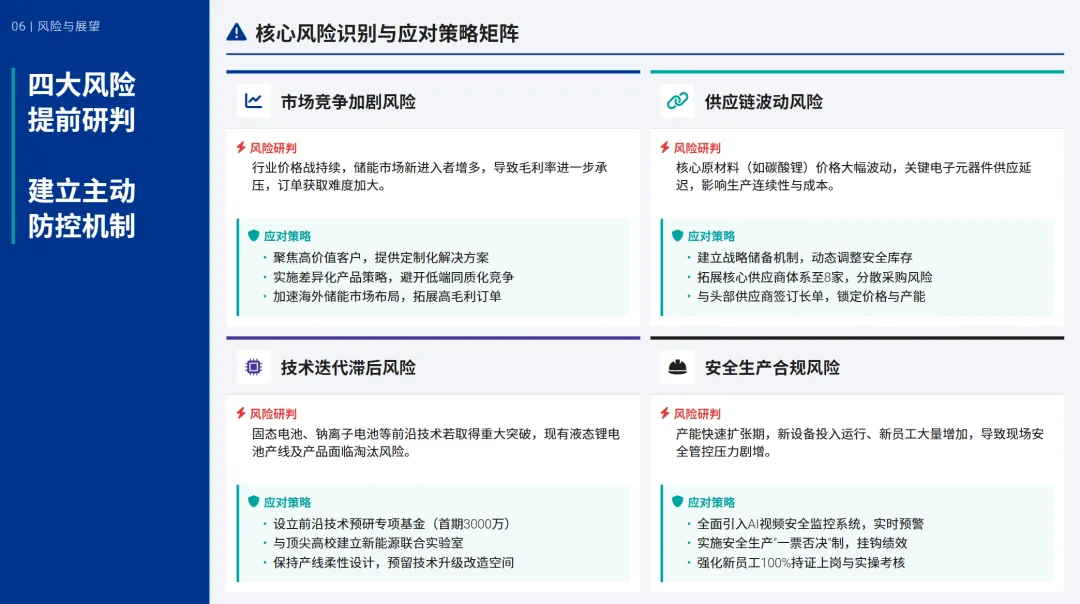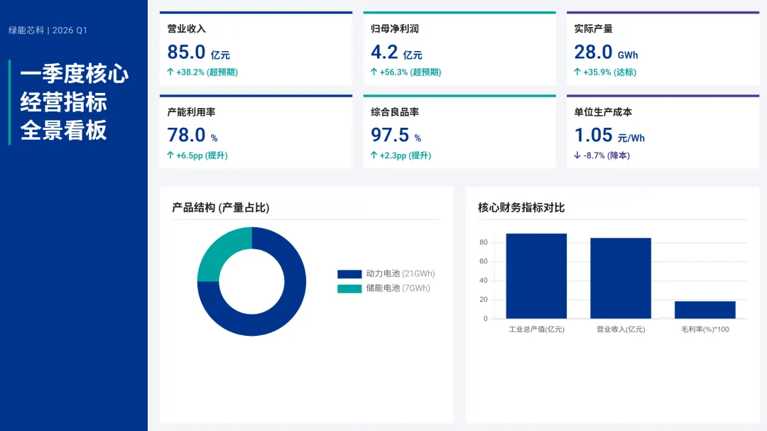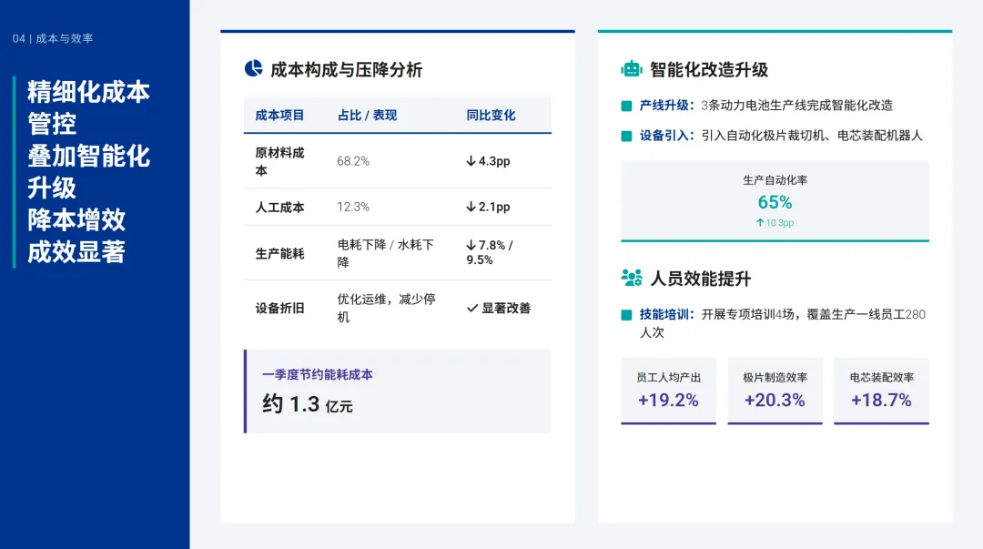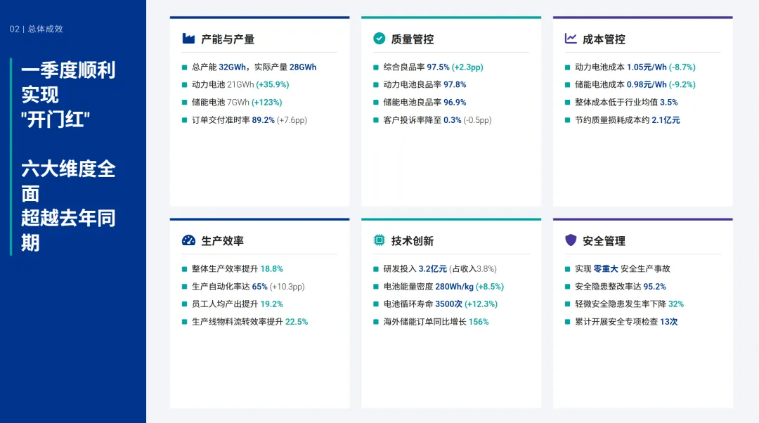 第一季度,公司总产能达32 GWh,蓄能电池产量较上年同期增长123%,交货准时率较上年同期提高7.6个百分点;质量全过程闭环控制,从原材料入库到生产出库,废品率较上年同期降低2.3个百分点,减少废品成本2.1亿元左右。在成本方面,通过精细化的成本控制,使得动力电池的单位成本下降了8.7%,蓄电电池的单位成本下降了9.2%,总成本比行业平均水平低了3.5%左右,第一季度的能源成本节约了1.3亿左右。生产端的智能化改造,带动了65%的自动化程度,人均劳动生产率提高了19.2%;研发投资3亿2千万元,推动了电池的能量密度和循环寿命的同步提升;安全生产,重大事故零发生,隐患整改率达到95.2%。