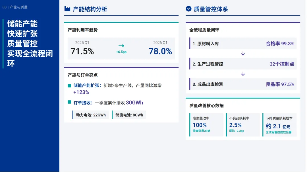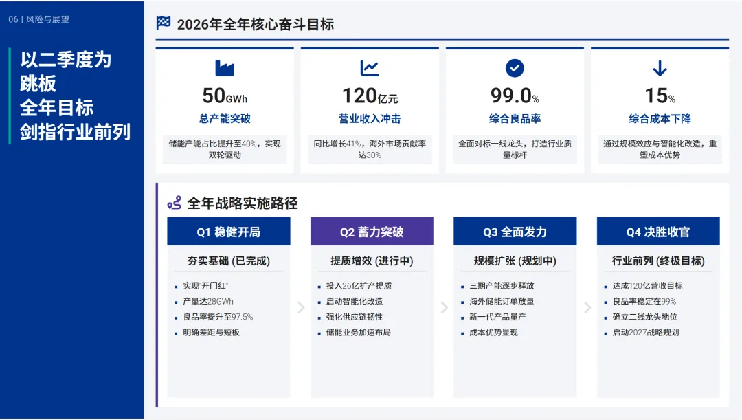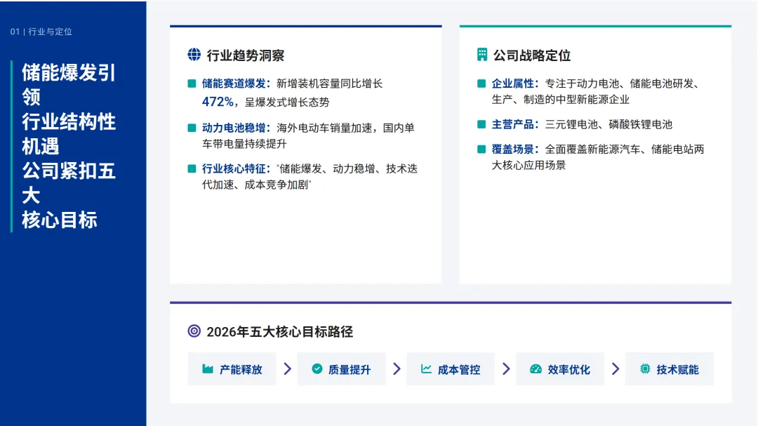 公司2026年一季度生产经营分析报告紧扣产能释放、质量提升、成本管控、效率优化、技术赋能五大核心目标,当前储能赛道新增装机容量同比增长472%,动力电池市场稳步增长,公司紧抓行业结构性机遇,一季度顺利实现经营“开门红”,核心经营指标全面超预期。