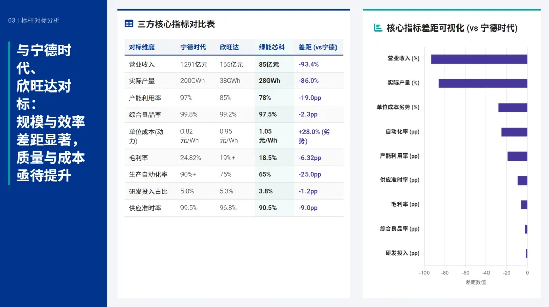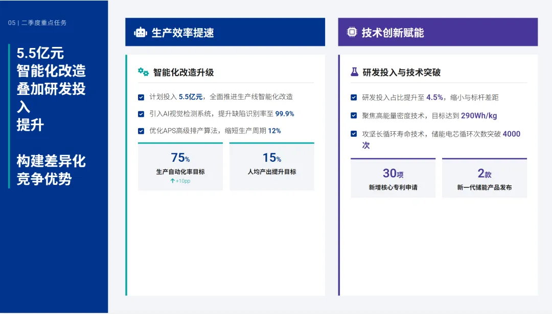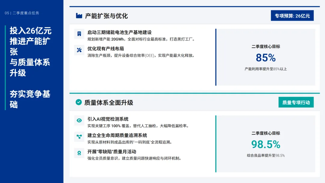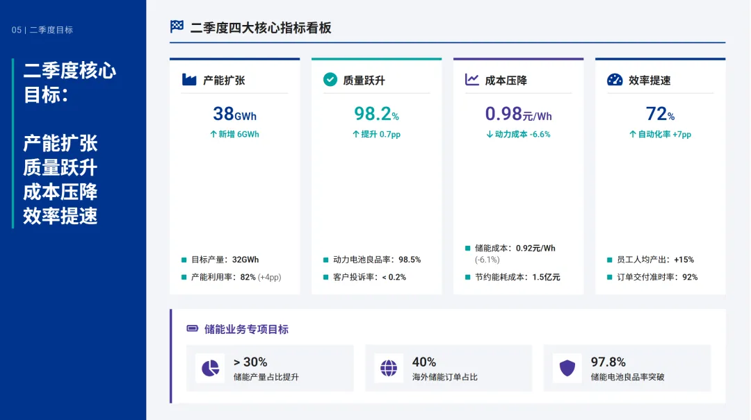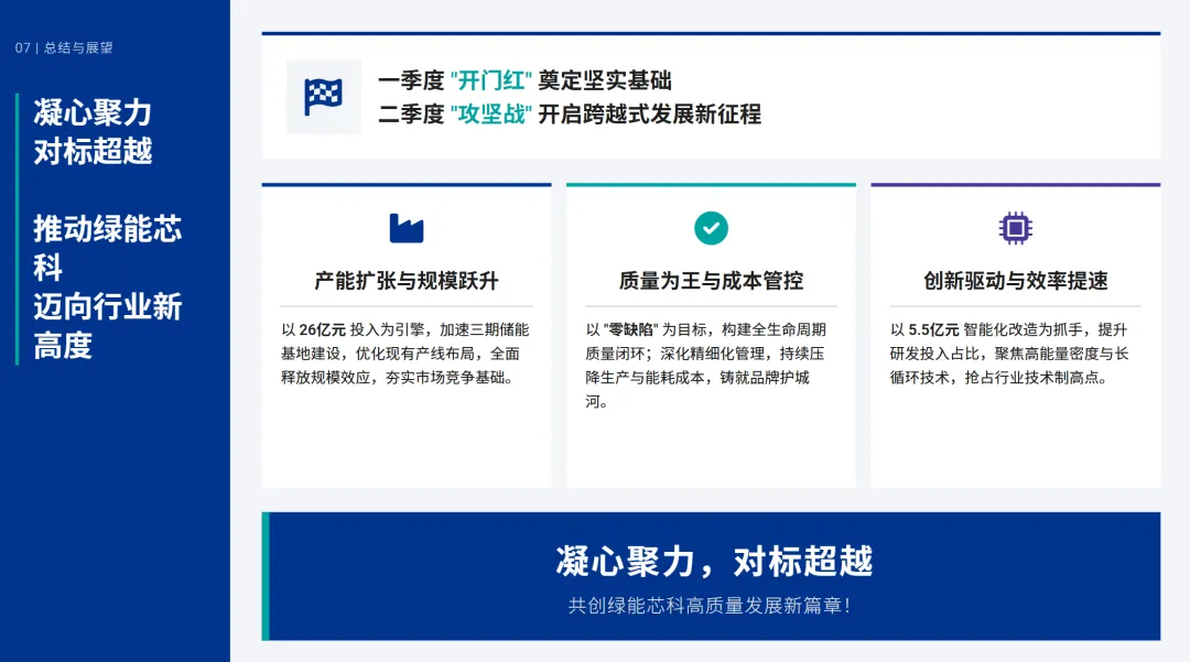 对比宁德时代和欣旺达,公司在产能、成本、自动化程度三个维度都有较大的差距,而战略布局不合理、资源投入不充分、体制机制不完善是制约公司发展的五大根本原因。二季度,公司围绕扩大产能、提升质量、降低成本、提高效率四个重点,在产能建设方面投入了26亿元,在智能化改造方面投入了5.5亿元,在储能领域实现了突破。预计今年全年总产能将超过50 GWh,营业额将达到120亿人民币,整体合格率将达到99.0%,我们将会以季度为单位,集中力量,力争成为国内第二大汽车制造企业。