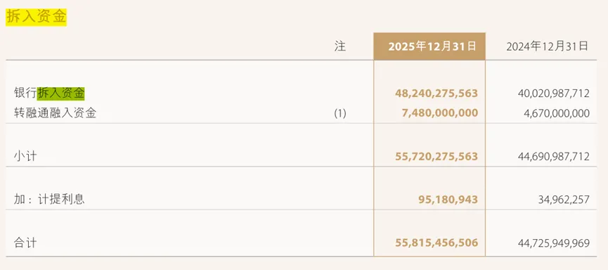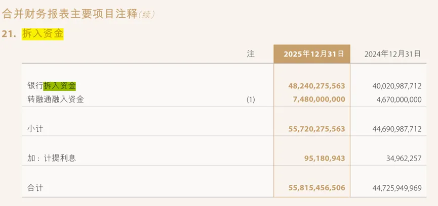 资产负债表附注中的“计提利息”:是指截至2025年12月31日已计提但尚未到付息日的应付利息,只是一个时点存量。它已经计入拆入资金账面价值,但只反映年末这一天尚未支付的利息。