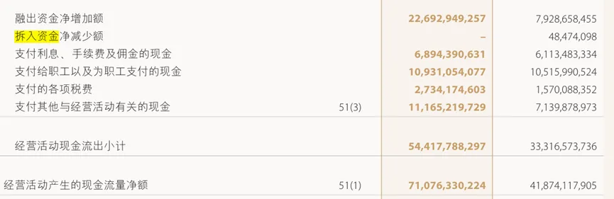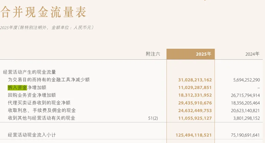 按照现金流量表列报惯例,“拆入资金净增加额”与“拆入资金净减少额”通常只出现其一,不会同时出现。合报中净增加110.29亿,意味着整个集团从外部净拆入了110.29亿元;而母公司净减少66.50亿,说明母公司层面在净偿还。