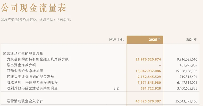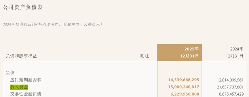 在前面短期融资款、递延所得税资产中中谈到25年的实际业务收入是大幅上涨的,充裕的资金带来更多业务的确定性,充裕之后就要开始调整整个债务端带来的压力。2025年母公司经营活动现金净流入达453.26亿元,拆入资金作为刚性负债,在流动性充足时优先偿还,可以有效降低财务杠杆。