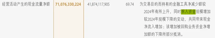 合报中有拆入资金的流入数据,但下面的母公司报表中并没有,这是为何?实际上合并表中"净增加110.29亿",意味着整个中金集团(母公司+所有子公司)从外部金融机构净拆入了110.29亿元,为啥后面是斜杆?大概率24年的拆入资金是净流出。(下图所示)