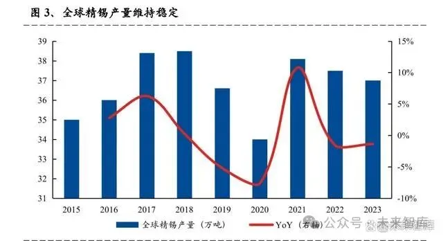 供应瓶颈明显,锡价中枢长期上移。在半导体需求稳步扩张的情况下,全球精锡供给保持稳定。国际锡业协会的数据显示,2015-2023 年全球精锡产量基本维持在35-40 万吨的水平。锡供需逐步抽紧使得锡价中枢长期上移。