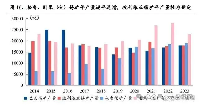 缅甸:2014 年以来,缅甸佤邦地区的低成本锡精矿冲击全球锡市场,使得缅甸成为全球主要产锡国之一,主要以小型矿床为主,生产技术相对落后。缅甸锡精矿主要来源于佤邦曼象矿区,该矿区目前是缅甸境内开采量最大的矿区,此外茂奇和德林达依锡矿带产量较小,受制于较差的基础设施条件和政策制约,短期产量难以提升。自 2019 年起缅甸锡产量明显下跌,主要由于2018 年后缅甸锡矿的过度开采,矿山品位下降使得开采成本提高。此外缅甸佤邦于 2022 年上调关税,并自 2023 年 8 月 1 日后矿山停止一切勘探、开采、加工等作业,目前仍未复产。