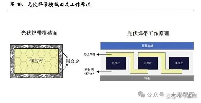 光伏焊带又称涂锡焊带,是光伏组件的重要组成部分,应用于光伏电池片的串联或并联,发挥导电聚电的重要作用,以提升光伏组件的输出电压和功率,占组件成本的 3%左右。焊带材料主要分为含铅焊带(原材料为铜、锡铅合金)和不含铅焊带(原材料为铜、锡银合金或锡铋银合金)两种,其中含铅焊带具有成本低、焊接可靠性高、导电性好等优势,仍为当前主要使用的互联方式,2022 年其市场占比超过 95%。