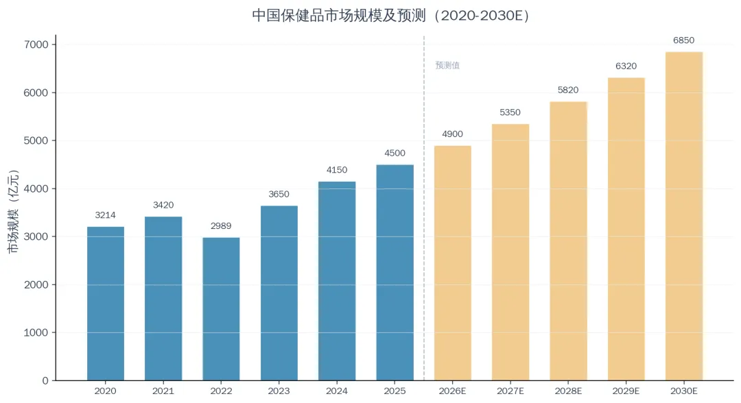 据多家研究机构数据综合统计,2020年中国保健品市场规模约为3214亿元,2021年增长至3420亿元,2022年受疫情反复、消费信心下降等因素影响短暂回调至2989亿元。2023年市场强劲反弹至3650亿元,同比增长22.1%,2024年进一步增长至4150亿元,2025年突破4500亿元。预计2026-2030年行业将保持约8-9%的年均复合增长率,到2030年市场规模有望达到6850亿元。