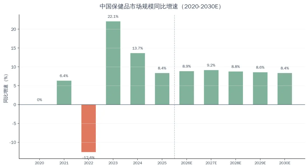 图2:中国保健品市场规模同比增速(2020-2030E)