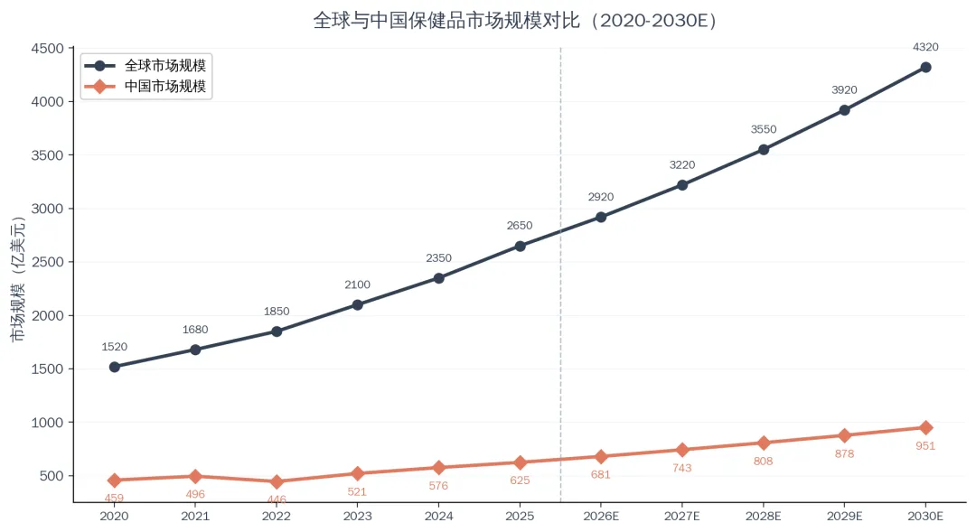2025年全球营养保健品市场规模约为5006亿美元,预计到2030年将增长至6578亿美元,复合年增长率约5.1%。中国市场占全球比重约为10-12%,但增速显著高于全球平均水平,是全球增长最快的主要市场之一。中国市场的核心优势在于庞大的人口基数、快速增长的老龄人口、以及消费升级带来的健康支出增加。