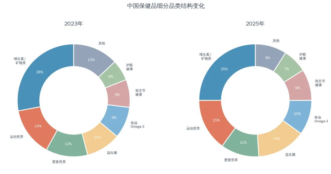保健品市场的品类结构正在经历深刻变革。传统的维生素/矿物质类产品仍占据最大份额,但其占比已从2023年的28%下降至2025年的25%。与此同时,益生菌类产品占比从10%迅速提升至14%,成为增长最快的品类;运动营养类稳步提升至15%;鱼油/Omega-3、骨关节健康、护眼健康等细分品类也均呈现增长态势。