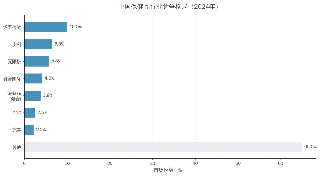 中国保健品行业集中度较低,属于典型的“大市场、小公司”格局。据Euromonitor数据,2024年汤臣倍健以约10%的市场份额位居行业第一,其次是安利(6.5%)、无限极(5.8%)、健合国际(4.2%)。CR5仅约29%,CR10仅约35%,其余65%的市场份额由众多中小品牌分割。线上渠道竞争更为激烈,2023年线上渠道CR10仅为24.53%。