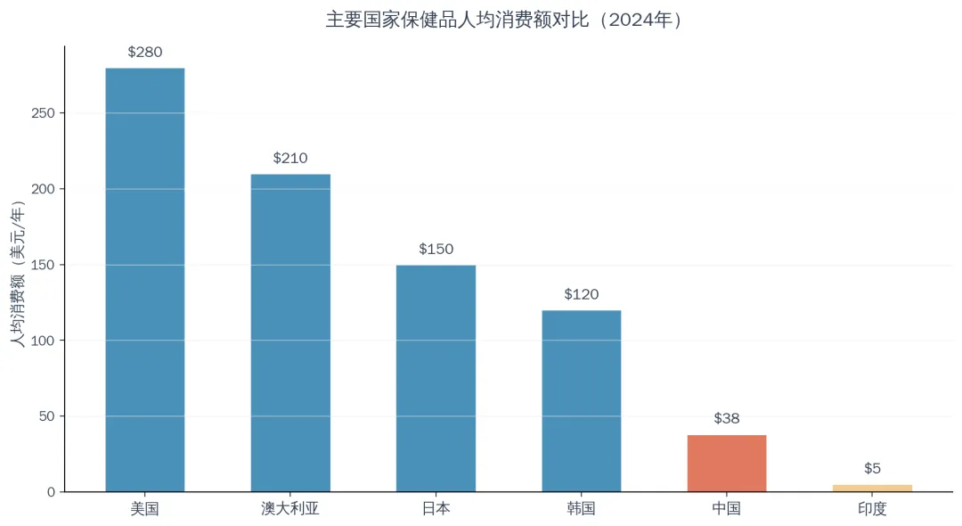 从全球视角看,中国已成为仅次于美国的全球第二大保健品市场,但人均消费额仅为38美元/年,远低于美国(280美元)、澳大利亚(210美元)、日本(150美元)等发达国家,市场渗透率仍有巨大提升空间。