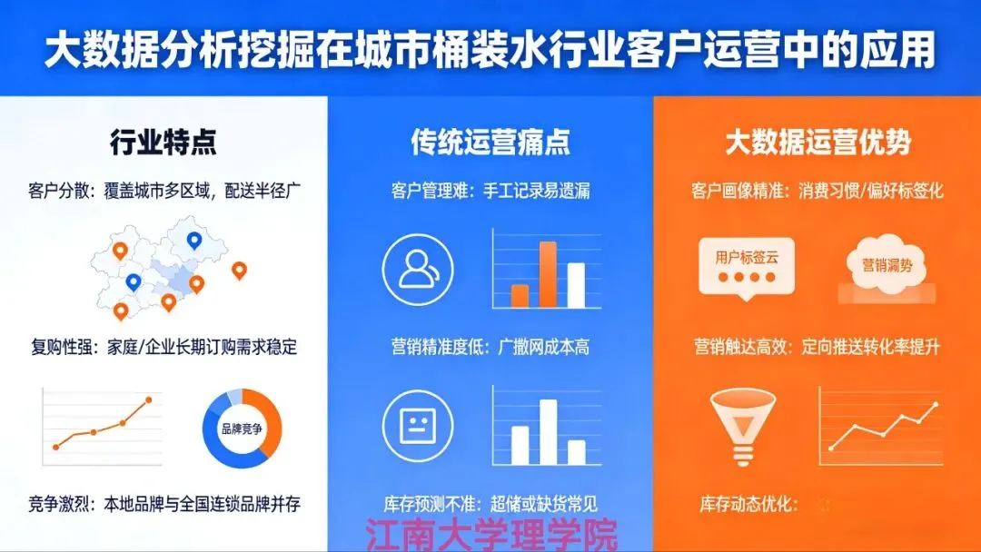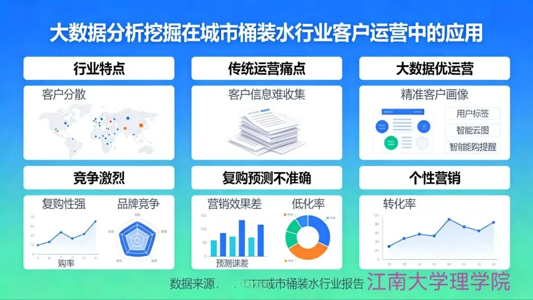 当前,商业企业在运营中面临诸多数据驱动的决策难题:电商平台如何精准识别价格敏感型用户,提升购物车转化率;传统行业如桶装水企业如何在激烈的市场竞争中稳定客户群体,避免陷入低价恶性竞争。本文正是基于这些实际痛点,结合具体商业场景,展开大数据分析挖掘的应用研究,旨在为桶装水企业提供可落地的数据分析方案,同时展现信息与计算科学专业在商业领域的实践价值。