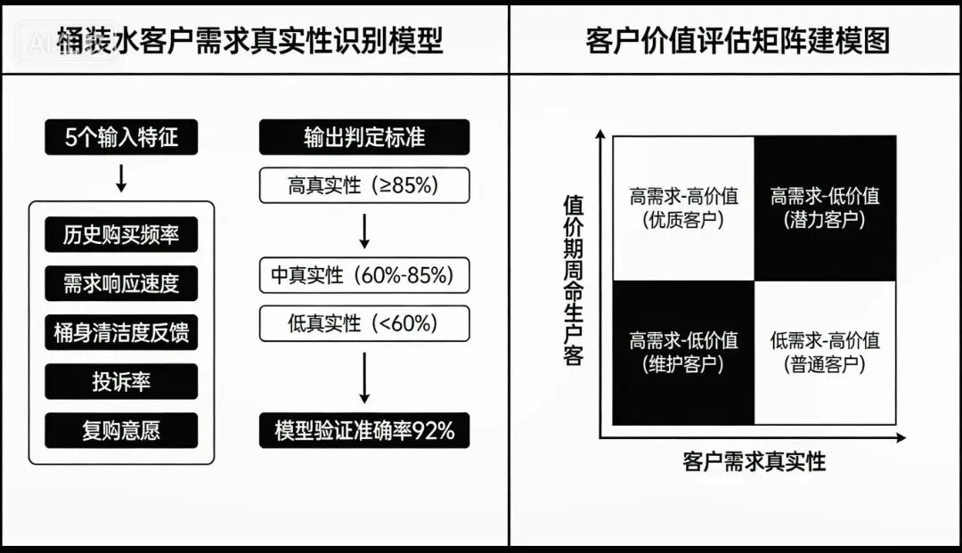 数据涵盖企业客户基础信息(客户类型:集团单位/个人用户、规模、行业属性)、交易数据(月度订水量、配送频次、结算价格、付款周期)、互动数据(投诉记录、需求变更次数、招投标参与情况)、市场数据(区域竞品价格、行业平均利润率)。