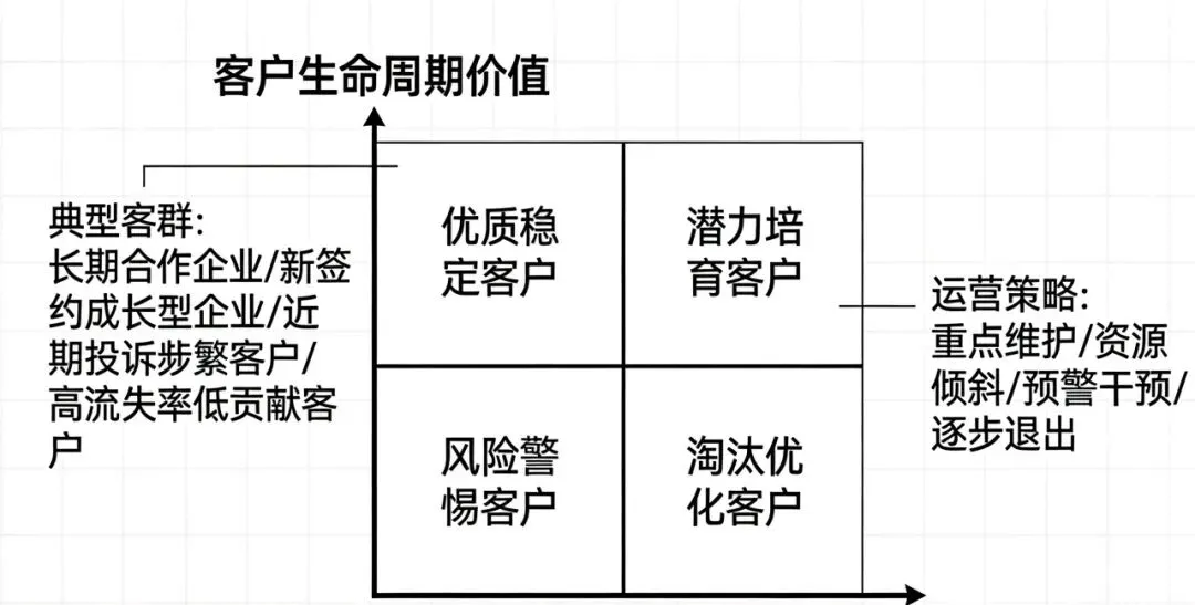 构建客户价值评估矩阵,以“客户需求真实性”为横轴,“客户 lifetime value(生命周期价值)”为纵轴,将客户划分为四类: