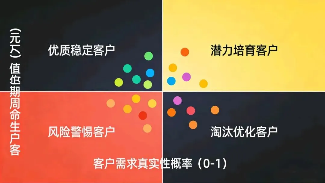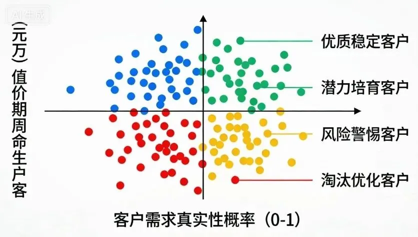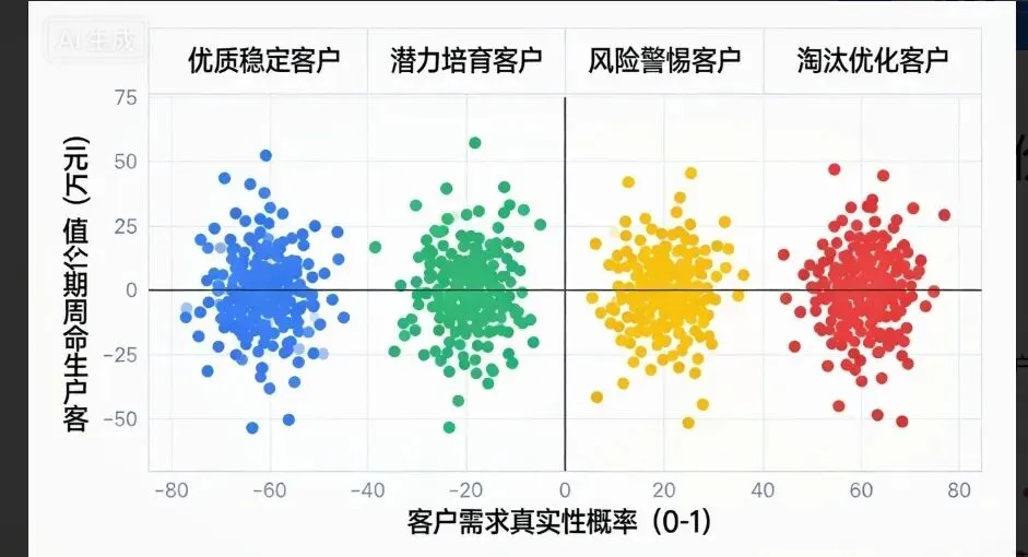 下图为客户需求识别与价值评估模型可视化图,横轴代表客户需求真实性概率,纵轴代表客户生命周期价值(单位:万元)。图中不同颜色的点代表不同类型的客户,清晰展现了客户分层结果,为企业制定差异化运营策略提供直观的数据支撑。