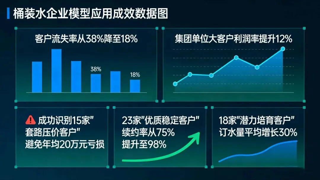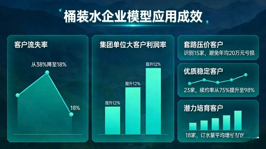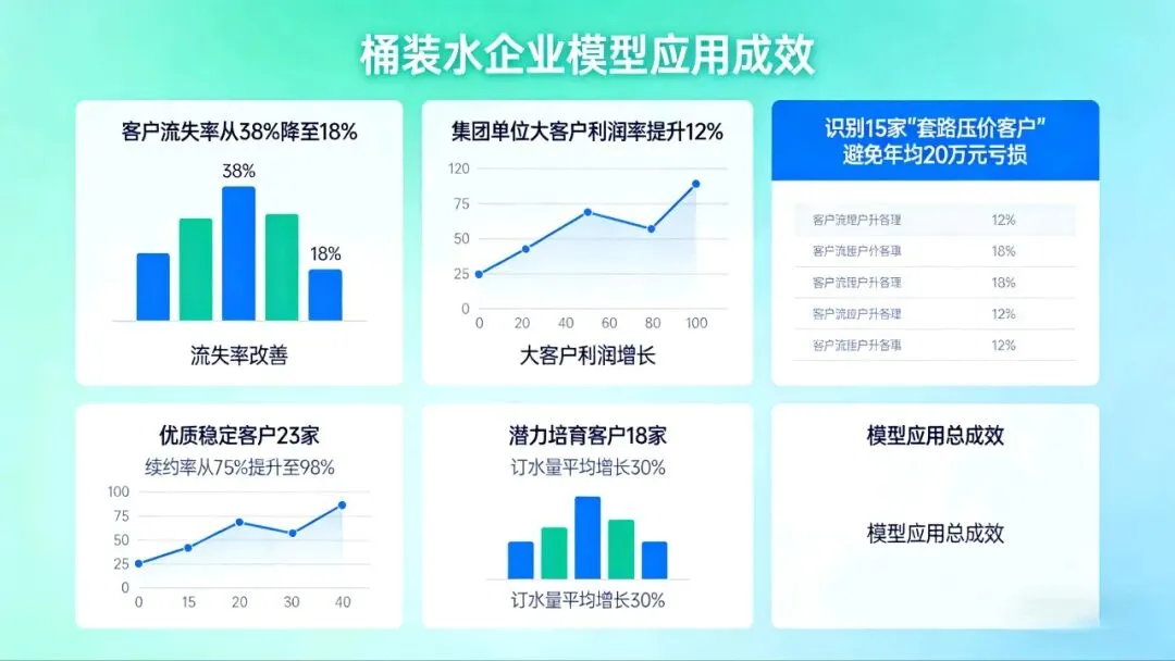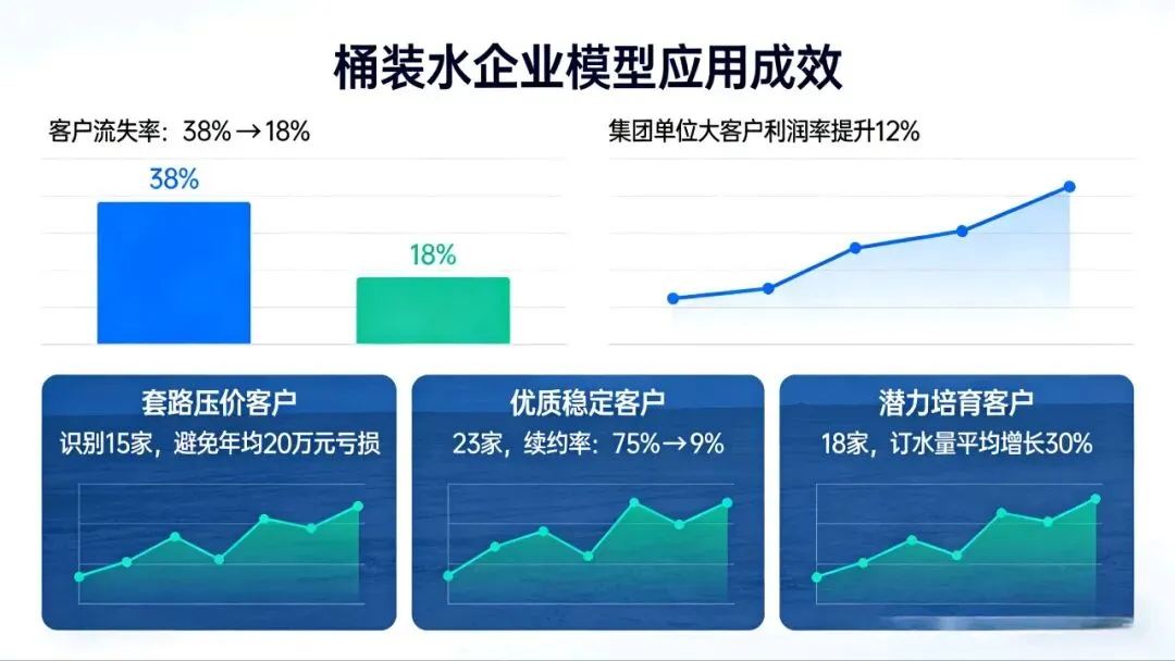 山东一桶装水企业应用上述模型后,客户流失率从38%降至18%,集团单位大客户利润率提升12%。具体成效如下: