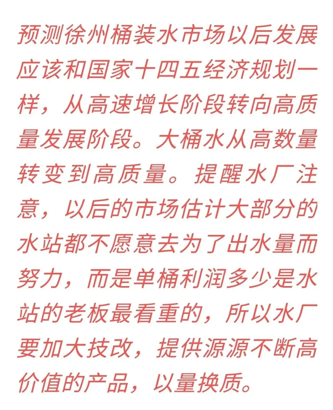 通过市场调研,近年来,净水设备的兴起,让桶装水市场发生了微妙的变化。徐州不少工厂停止购买桶装水,直接买个净水器,过滤一下自来水,再烧开,供工人饮用。在一些小区,居民在净水机前排队打水,投入一二元钱,把满满一桶水抱回家。净水设备越来越多,对桶装水行业构成了最大的挑战。尽管正规桶装水的安全系数比净水设备生产的自来水要高,但后者价格却低廉得多。这对于全国食品饮料行业企业有一定的借鉴意义。食品行业说不定以后老百姓也会追求性价比原生态的产品。桶装水和食品行业会越来越认准高性价比 + 原生态/天然/健康的产品。