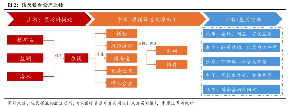 镁合金产业链是一条以镁资源为起点、终端为高端制造的多层级工业链条。镁合金产业链主要包括上游资源开采与原镁冶炼、中游材料加工与合金制备、下游产品应用三大环节。镁产业链的上游主要是从菱镁矿、白云石、盐湖镁卤水等含镁资源中提炼出原镁;中游是将原镁转化成镁合金,再将镁合金通过铸造、变形等工艺加工成镁合金型材与铸件;下游产业主要是对镁合金进行深加工,通过压铸等工艺,形成能满足下游特殊性能需求的镁合金系列材料。