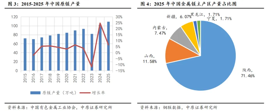 中国原镁产量占比全球领先。根据中国有色金属工业协会镁业分会数据,2025年全球原镁产能179万吨,中国产能146.82万吨,占比约82.02%。全球原镁产量122.6万吨,中国产量109.35万吨,占比约89.19%。2025年我国镁合金产量42.84万吨,同比增长8%,镁粉产量10.67万吨,同比缩减4.2%。镁合金及深加工产品增速显著高于原镁冶炼。从产量和产能占比来看,中国是全球镁产业的主导者,原镁产能/产量占比超80%,其中陕西为核心产区,全年产量占比在70%左右,供给端高度集中。