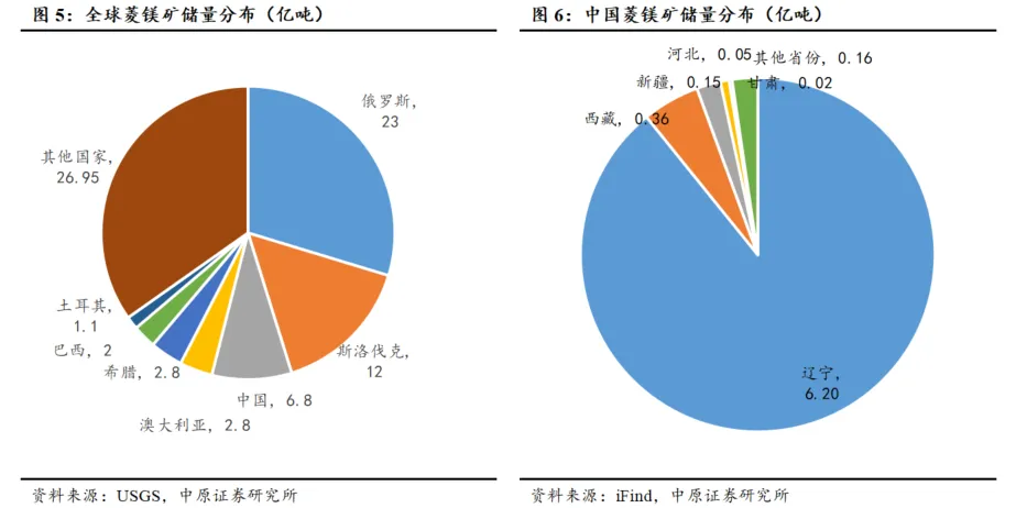 菱镁矿是电解法生产原镁的主要原料,辽宁省菱镁矿资源丰富。根据美国地质调查局USGS数据,俄罗斯、斯洛伐克、中国是全球菱镁矿储量前三的国家,储量分别为23、12、6.8亿吨,三国合计储量占全球总量的53.97%,分别占全球总储量的29.70%、15.49%、8.78%。我国菱镁矿资源具有地理分布集中、大型矿床多等特点,产地主要分布在辽宁、西藏、新疆等地区,储量分别为6.20、0.36、0.15亿吨,分别占全国总储量的89.20%、5.23%、2.19%,其中辽宁省的辽东地区(营口至大石桥至海城一带)是世界级菱镁矿资源集中区,且矿石品质优良。