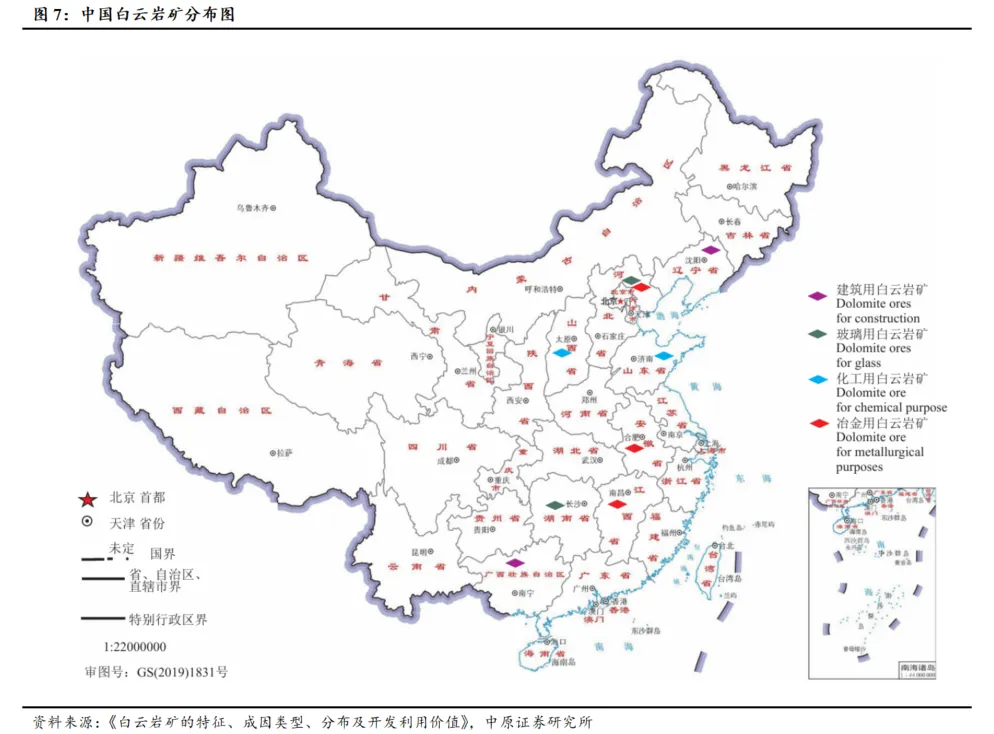 白云石矿是皮江法生产原镁的主要原料,中国白云石矿产资源储量丰富、质量优。白云石是一种重要的钙镁资源,是我国冶炼金属镁的主要原料,大约冶炼1吨金属镁需要10吨左右的白云石矿。全球白云石储量资源储量主要分布在中国、美国、意大利等国家。其中中国白云石矿产资源分布广泛,储量丰富、质量优,目前已探明可开采白云石矿资源储量超过200亿吨,冶镁白云岩(镁矿)保有资源储量超过40亿吨,产地主要分布在辽宁、陕西、山西、宁夏、河南、青海、贵州等省份,其中山西冶镁白云岩(镁矿)保有资源储量8.45亿吨,居全国第一位。我国镁资源和其产业主要集中在陕西省榆林市,其镁矿石主要来自于山西省。陕西省原镁产量居全国第一,山西省居第二。
