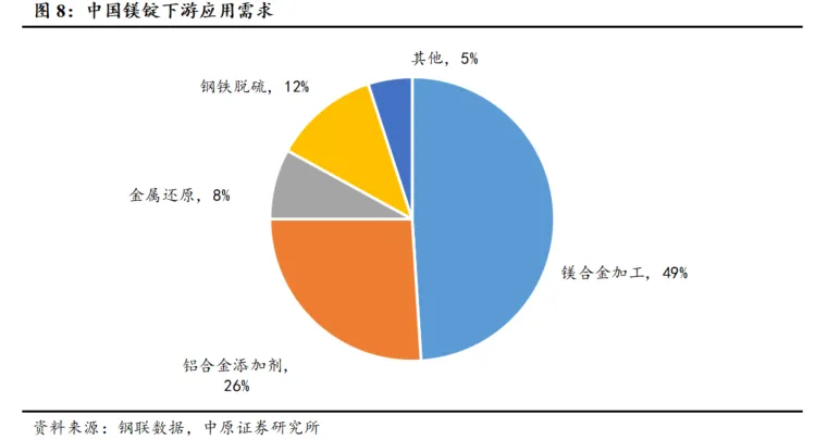 镁合金加工、铝合金添加剂、海绵钛以及钢铁脱硫是镁锭的主要应用领域。从消费结构看,原镁主要流向镁合金深加工领域,占比达49%;其次用于铝合金添加剂,占比26%。其余部分则应用于海绵钛等金属还原、钢铁脱硫等传统工业环节。2024年全球镁总消费量达112万吨,其中镁合金领域消费量55万吨,是主要的原镁应用领域。