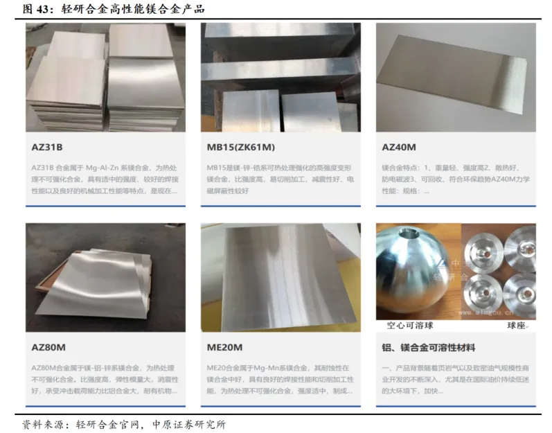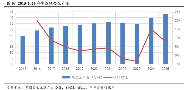 新能源、交通装备等领域对轻量化材料需求扩大,镁合金产量持续增加。2015-2021年,在汽车、3C需求驱动下,中国镁合金年产量从24.16万吨稳步提升至36.50万吨。2022至2023年受疫情扰动、原料价格高位及下游需求偏弱影响,产量连续两年小幅回落。2024年起在新能源汽车轻量化、交通装备升级、机器人与低空经济等新兴场景的带动下,行业需求迎来拐点,镁合金产量快速增长。2025年,全年镁合金产量42.84万吨,同比增长8%。