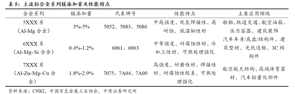 铝合金添加剂是镁的第二大下游应用领域。2024年镁作为铝合金添加剂的消费量达29.5万吨,占全球镁总消费的26%。镁作为铝合金核心添加剂,可以降低合金整体密度、提高铝合金整体强度和耐腐蚀性能、改善加工与铸造性能,是5XXX、6XXX、7XXX 等主流铝合金牌号的核心添加剂。在新能源汽车轻量化、轨道交通、光伏型材、航空航天及高端装备制造快速发展的背景下,全球及国内铝合金产量持续扩张,叠加高端合金牌号占比提升,带动铝合金用镁需求稳步增长。