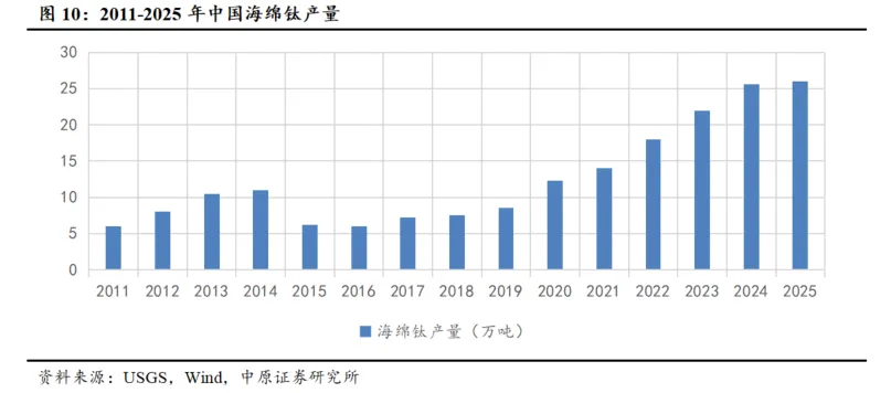 海绵钛是金属还原用镁的主要应用领域。在金属还原环节,原镁主要用于钛、锆、铍、铀和铪等稀有金属的还原、提炼。与海绵钛相比,锆、铍、铀等其他稀有金属的产量规模较小,且镁热还原法(克劳尔法)是海绵钛工业化生产的主流工艺,因此海绵钛生产过程中的用镁量远高于其他稀有金属。镁在金属还原领域的消费趋势与海绵钛产量变化趋势基本一致。随着航空航天、军工装备、新能源、化工防腐等高端领域对钛材需求持续提升,海绵钛产能稳步扩张,金属还原用镁需求提升。