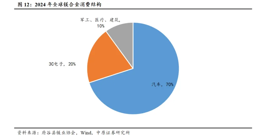 镁合金下游应用广泛,汽车是主要应用领域。镁合金具有轻质、高比强度、良好阻尼减震及电磁屏蔽等优异性能,是工业轻量化的关键结构材料。主要应用领域包括汽车、3C电子、航空航天、生物医用、建筑材料等领域。其中汽车及新能源汽车为镁合金最主要应用领域,2024年消费量达38.5万吨,占镁合金消费总量的70%。
