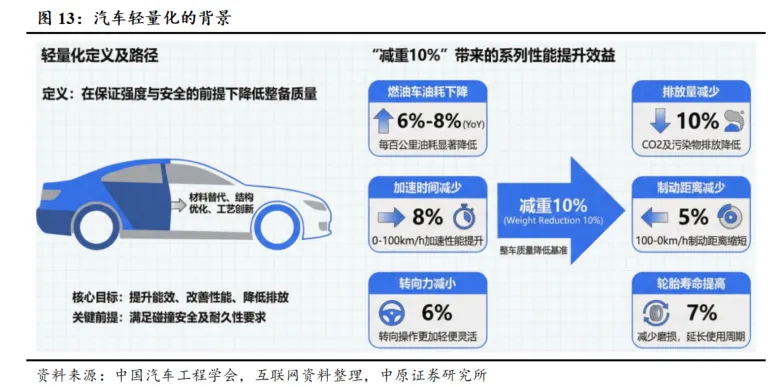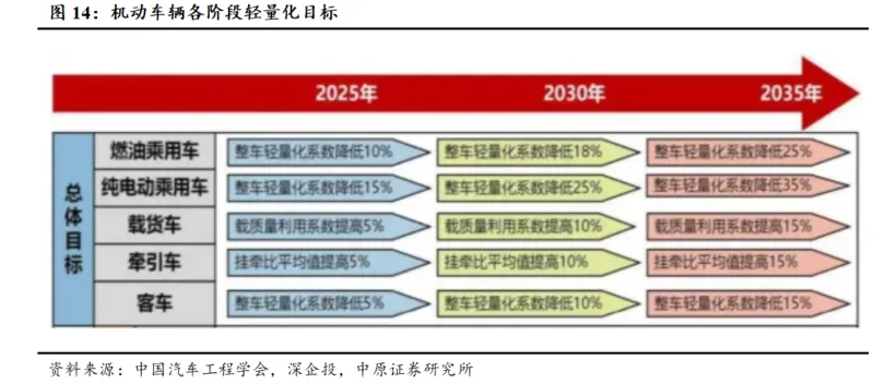 在“双碳”政策和严苛的油耗法规约束下,我国汽车轻量化各阶段目标明确。根据《节能与新能源汽车技术路线图2.0》,至2025年,燃油乘用车和纯电动乘用车的轻量化系数需分别降低10%和15%;到2035年,这一目标将进一步提升至25%和35%。