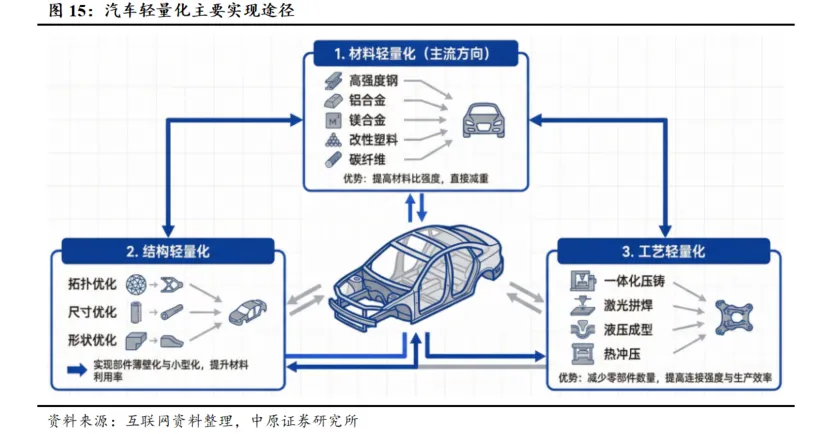 从目前国际通行的研究方向来看,结构轻量化、工艺轻量化、材料轻量化是汽车轻量化的三个主要技术方向,其中材料轻量化是核心。结构轻量化是指采用模块化集成零件,减少零件数量,通过结构拓扑优化,合理设计车身闭环传力结构等。工艺轻量化是指运用先进的制造工艺技术,如激光拼焊、辊压成形、高强度钢热成形、内高压成形等,如结构件一体压铸技术。材料轻量化是指用高强度和轻质材料替代传统的低碳钢,从源头进行减重,比如应用铝合金材料,如前碰撞横梁、发动机舱盖、轮鼓包、钢铝混合车身等,可以减重30%以上。