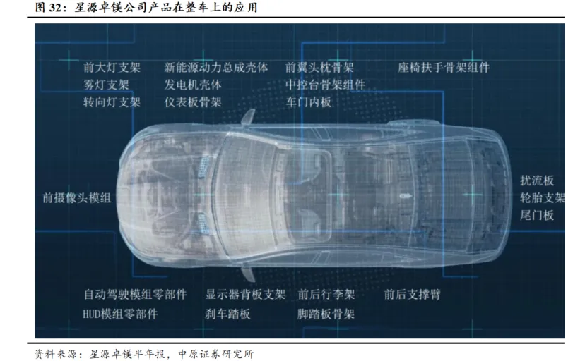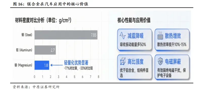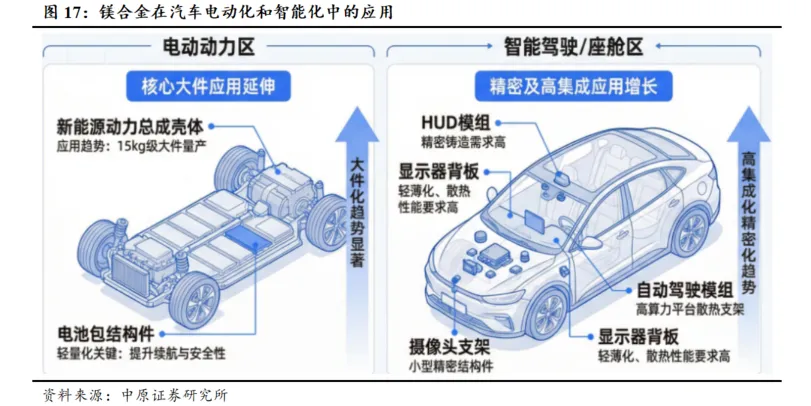 这些特性推动镁合金在智能汽车的新增部件中快速渗透,从智能座舱的仪表骨架、中控支架,到智驾系统的传感器安装支架、算力平台壳体,镁合金实现了“结构减重+功能防护”的一体化,成为智能汽车电子部件的首选材料,进一步打开了镁合金的增量空间。