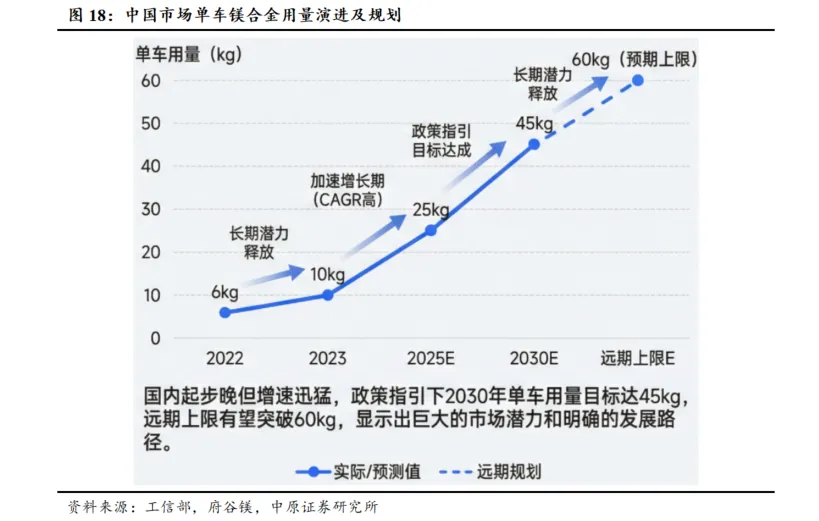 全球及国内市场的镁合金在汽车领域的应用正呈现出差异化发展、加速渗透的特征,单车用量持续提升。从全球市场来看,汽车已成为镁合金最大的下游应用领域,2025年全球原镁消费约118万吨,其中汽车领域贡献70%的需求,镁合金在汽车中的应用已进入规模化普及阶段。我国汽车镁合金应用起步较晚,过去长期存在“原镁大省、应用小国”的错位,我国拥有全球最完善的镁产业链,资源、产能、成本均全球领先,但早期下游加工技术不足,车用镁合金的应用滞后,2020年国内汽车单车用镁量仅5kg,不足北美地区的1/3,且应用集中在低端内饰件,大量原镁以原材料形式出口,高端镁合金加工件依赖进口。受益于新能源汽车产业的快速发展,中国汽车镁合金应用规模持续扩大,2024年国内汽车单车平均用镁量约10-12.3kg,新能源汽车单车用量达15-25kg。2025年,国内主流车型单车用镁量提升至20-45kg,据工信部规划,2025年汽车单车用镁量目标为25kg,2030年将达到45kg。从产能来看,中国占据全球85%以上的原镁产量,2025年国内镁合金产量突破42万吨,同比增长超22%,陕西府谷、山西闻喜、安徽青阳三大基地贡献超70%的产量,行业集中度较高,形成了从矿产、冶炼到加工、回收的全链条闭环,为汽车镁合金应用提供了稳定的供应链支撑。