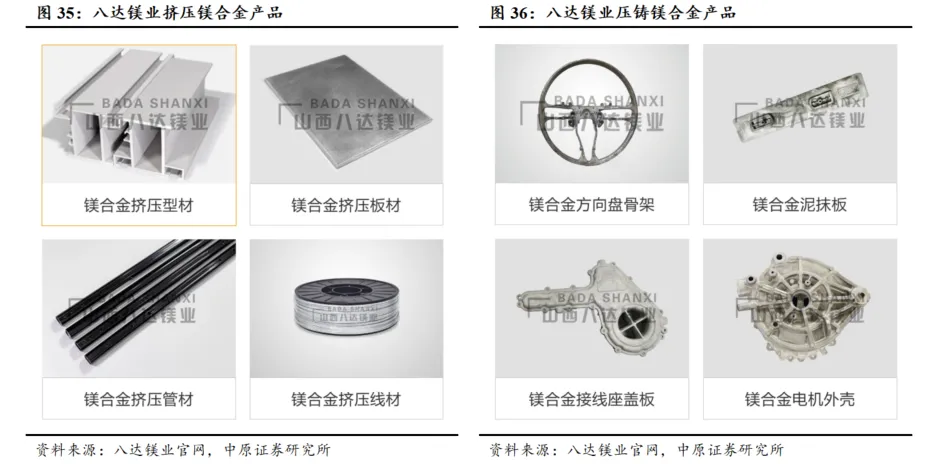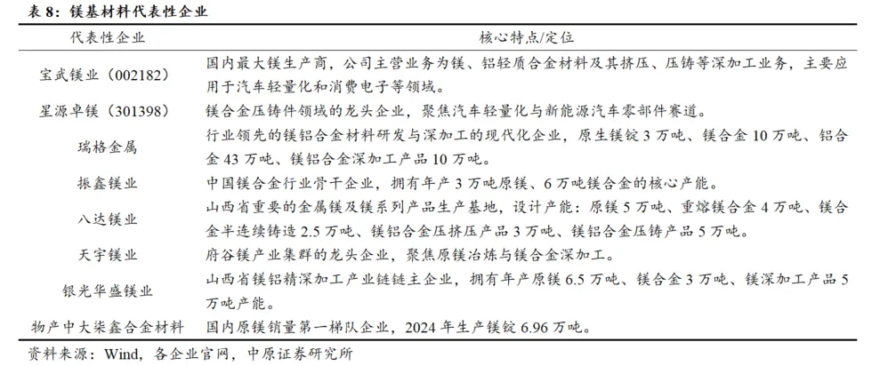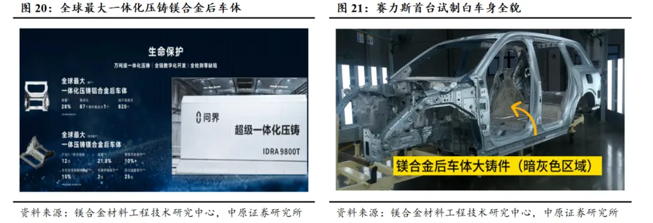 整车企业加速镁合金应用,从高端车型向中端车型扩展,由“中小件试水”加速迈向“大件规模化量产”。传统上,镁合金主要应用于豪华品牌车型或高端车型,是镁合金应用的核心阵地,随着成本下降和技术成熟,华为系、小鹏、小米、吉利等优质自主品牌率先布局,加速镁合金零部件装车落地,带动行业应用趋势形成。当前主流整车企业对镁合金的应用已从传统内饰小件逐步向核心结构件、三电系统及一体化车身升级,落地案例日趋丰富。比亚迪在汉 EV、海豹等主力车型上规模化应用镁合金座椅骨架、仪表支架及电驱壳体,并推进更高比例的车身用镁方案;赛力斯在问界车型上实现大型一体化压铸镁合金后车体量产,大幅提升轻量化与刚性水平;特斯拉在 Model 3/Y 等车型上将镁合金用于一体化压铸相关结构件及电池包部件,进一步优化整车重量与续航表现。蔚来、小鹏、理想等新势力车企也广泛采用镁合金仪表板横梁、座椅骨架、锻造轮毂等部件,持续提升轻量化水平。一汽、长城、小米汽车等则在镁合金电池结构件、减震塔、车门内板等领域实现技术突破与装车应用。国际车企如宝马、奥迪、大众等同样延续镁合金应用优势,从传统动力壳体拓展至新能源电驱壳体、车身结构件等场景。整体来看,整车企业对镁合金的应用正由辅助轻量化部件向关键承载结构升级,单车用量持续提升,成为新能源汽车减重增效、提升续航与安全性能的重要技术路径。