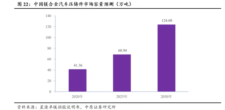 受益于政策驱动、技术成熟与市场需求释放,镁合金在汽车轻量化中的市场空间将持续扩大。根据星源卓镁测算,2020年、2025年、2030年中国镁合金汽车压铸件市场规模将分别达到41.36万吨、68.94万吨和124.09万吨。根据府谷镁预测,2028年中国乘用车镁合金需求量将达60万吨,全行业需求突破90万吨。其中,新能源汽车贡献了70%以上的增量,单车镁合金用量提升至35-40kg;2030年,单车镁合金用量目标为45kg,占整车质量的4%,全行业需求量预计达130万吨。新能源汽车领域的镁合金需求占比超过80%,成为绝对主力市场。从经济价值来看,车辆减重带来的收益显著,减重100kg等效节省电池成本3200-5120元,而镁合金增量成本仅1500-2000元/车,单车净收益可观,将进一步推动车企加大镁合金应用力度。此外,电动自行车新国标催生的“以镁代塑”浪潮,也将带动镁合金产业整体发展,间接支撑汽车领域的应用升级。