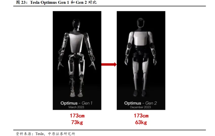 机器人轻量化可以增强运动灵活性与响应速度。重量降低减少了运动部件的惯性,使得机器人在执行相同动作时,对电机输出扭矩的要求降低,响应速度更快,动作更精准流畅,提升运动控制的稳定性和精度。此前,特斯拉在2023年12月发布的Optimus Gen2,与第一代相比,体重从73kg降至63kg,减重10kg,行走速度提升30%,平衡性和全身控制力也有所提升。