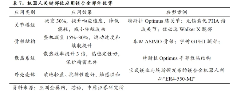镁合金是机器人轻量化的关键材料。密度方面,镁合金密度比铝轻约33%,强度显著优于工程塑料,成本低于钛合金。应用在机器人机身、关节、支架、外壳,可实现30%-50%减重。力学性能方面,镁合金比强度高、减震性优秀,在强度、精度、一致性上都能满足机器人长期高负荷运行。工艺方面,镁合金半固态成型可实现薄壁、高筋、高精度一体成型,减少零件数量、降低装配难度,同时提升整体刚性与稳定性。