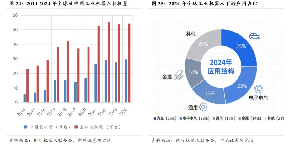 工业机器人快速发展,带动镁合金需求。根据国际机器人联合会《2025年世界机器人报告》,2024年全球在役工业机器人存量达到466.4万台,同比增长9%,其中中国在役工业机器人达202.7万台。2024年全球新安装工业机器人54.2万台,其中中国新安装29.5万台,占50%以上。从长周期看,中国工业机器人在2015至2024年间装机量的年复合增速高达17.52%。从下游应用场景来看,工业机器人的应用广度正在不断拓宽。目前,汽车行业和电子电气行业仍是应用主力,2024年全球装机量占比分别达到25%(13.5万台)和23%(12.6万台)。随着应用基数的不断扩大,对机器人机械臂、外壳等部件的材料升级需求日益迫切。目前镁合金轻量化方案已经开始落地。宝武镁业与国产工业机器人龙头埃斯顿共同推出了名为“ER4-550-MI”的镁合金机器人。相比传统铝合金版本,该型号单机用镁量约4.97千克,成功减轻自身11%的重量65。轻量化不仅直接提升了5%的节拍速度,还因镁材料优秀的减震与散热特性,使整机能耗降低了10%,大幅提高了运行效率与稳定性。