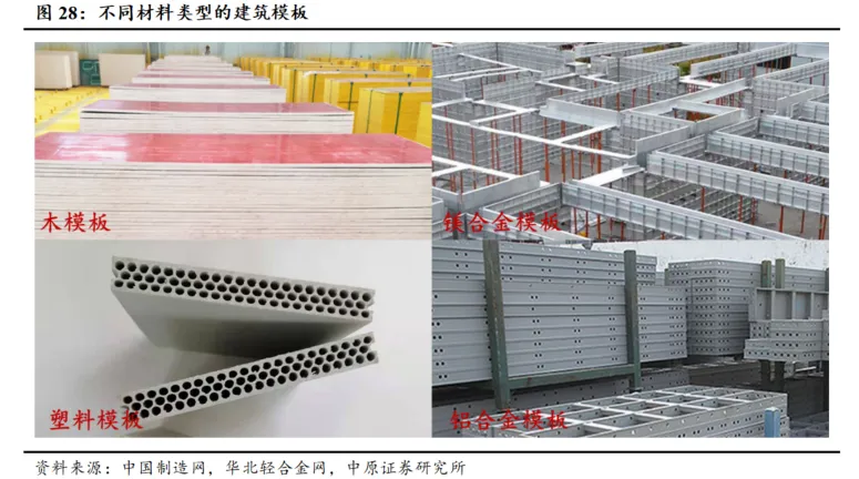建筑模板市场以木模板为主,铝合金模板市占率逐渐提升。木模板在我国使用时间最早,施工工艺较为成熟,凭借造价低廉、质地轻便、易于进行现场切割加工等核心优势,市场占有率超过50%。但木模板周转次数低,对技能木工的依赖度高,且产生大量的现场建筑垃圾,用完即废弃,无法循环利用,由于铝合金模板具有周期短、精度高、安装方便、环保等优点,被国家提倡使用,市场占有率持续提升,已超过20%。但是铝合金材料模板存在耐酸不耐碱的缺点。建筑混凝土为保护钢筋提高自身强度,混凝土的化学性质为弱碱性,因此铝合金模板会被碱性物质所腐蚀。