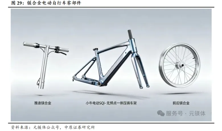 镁合金材料得到电动自行车头部企业实践验证,随着需求放量将进一步摊薄成本。目前,爱玛、雅迪、小牛等电动车龙头企业已在轮毂、车架等关键部件上应用镁合金材料,在车身轻量化、续航提升及减震舒适性等方面效果显著。随着新国标的实施,泥板、搁脚、电池外壳等覆盖件和电气组件将广泛采用镁合金。电动自行车镁合金零部件的集中放量应用,将摊薄生产成本,形成对铝合金的成本优势,进而持续拉动镁合金应用规模扩大。根据中国有色金属工业协会镁业协会预测,“十五五”期间镁合金在电动两轮车领域的用量将保持快速增长态势。我国电动两轮车年产量超5000万台,将为镁合金带来每年10万吨以上的新增需求。
