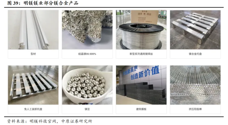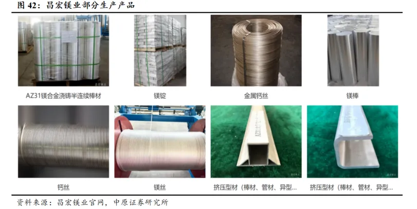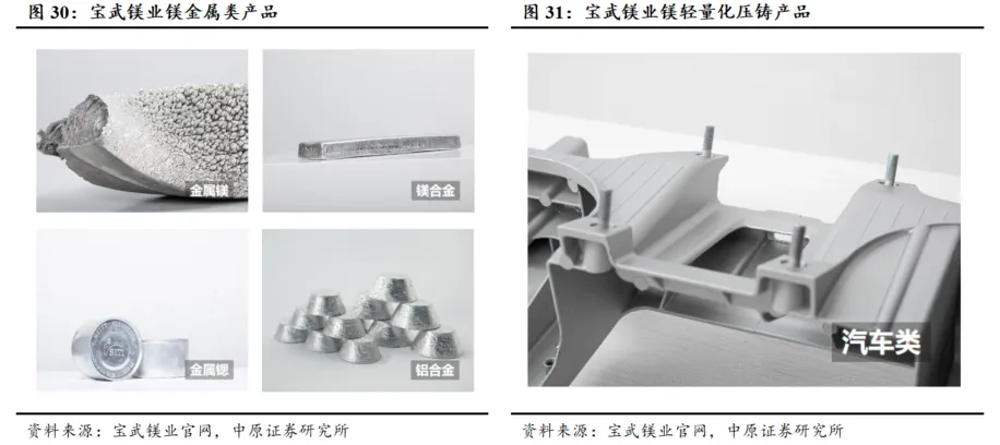 公司是国内镁产业龙头企业,其前身云海金属集团成立于1993年,2007年在深交所上市。公司主营业务为镁、铝合金材料的生产及深加工。产品主要应用于汽车、电动自行车轻量化、消费电子及建筑等领域。公司拥有“白云石开采-原镁冶炼-镁合金熔炼-镁合金精密铸造、变形加工-镁合金再生回收”完整产业链。2025年上半年,公司各业务板块收入占比为:铝合金深加工(35.90%)、镁合金产品(26.03%)、中间合金(13.14%)、镁合金深加工(11.10%)、铝合金(6.67%)。截至2025年4月末,宝武镁业拥有10万吨原镁产能及20万吨镁合金产能。另外公司正推进多项产能扩建项目,在巢湖新建5万吨原镁产能、在五台新建10万吨原镁和10万吨镁合金、在青阳新建25万吨原镁和30万吨镁合金产能。在新建产能投入后,合计原镁和镁合金将会分别达到50万吨和60万吨。