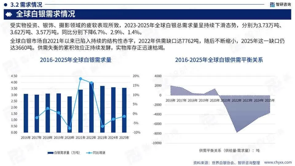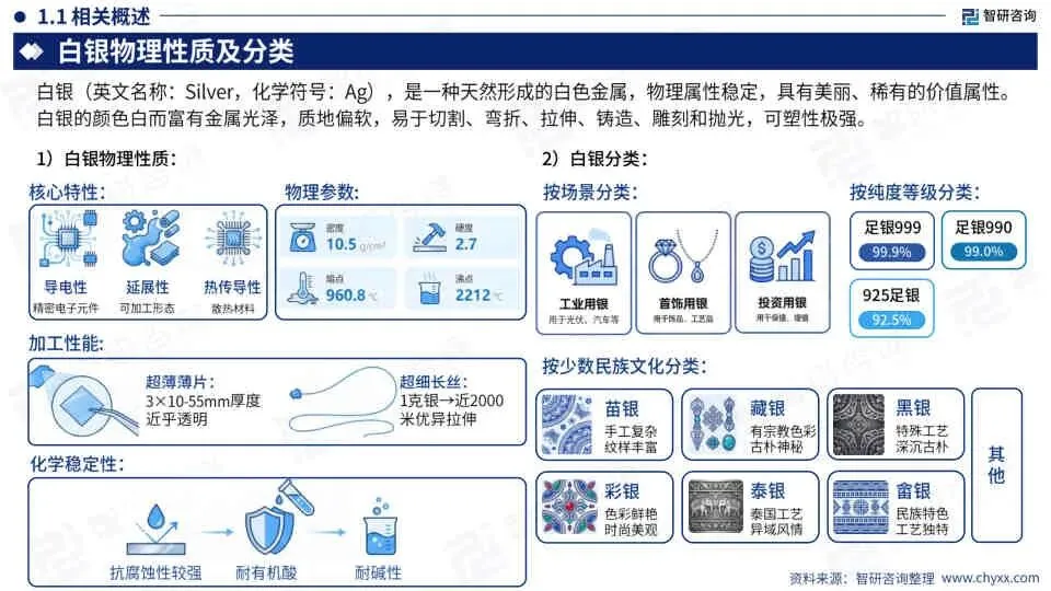 这份由智研咨询发布的《2026年中国白银行业市场供需现状及发展趋势研判报告》,基于2025年的市场数据,全面剖析了中国白银行业在“供不应求”背景下的产业变革。报告指出,白银属性已从传统的货币/饰品向“工业核心金属”转变,光伏、新能源汽车及AI算力成为需求增长的新引擎,而资源稀缺与环保压力则倒逼行业进行技术革新与绿色转型。以下是核心内容总结: