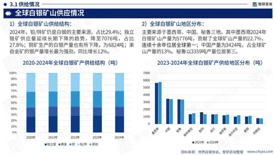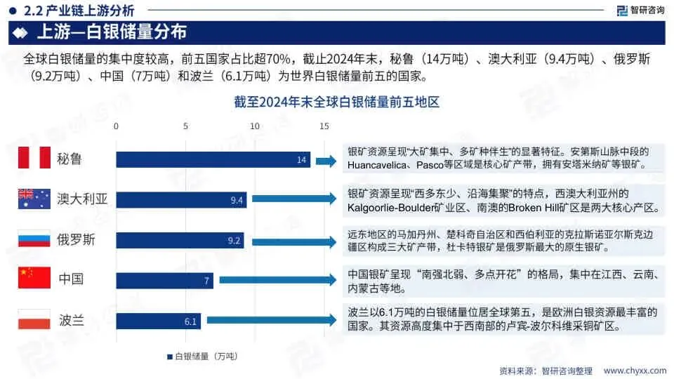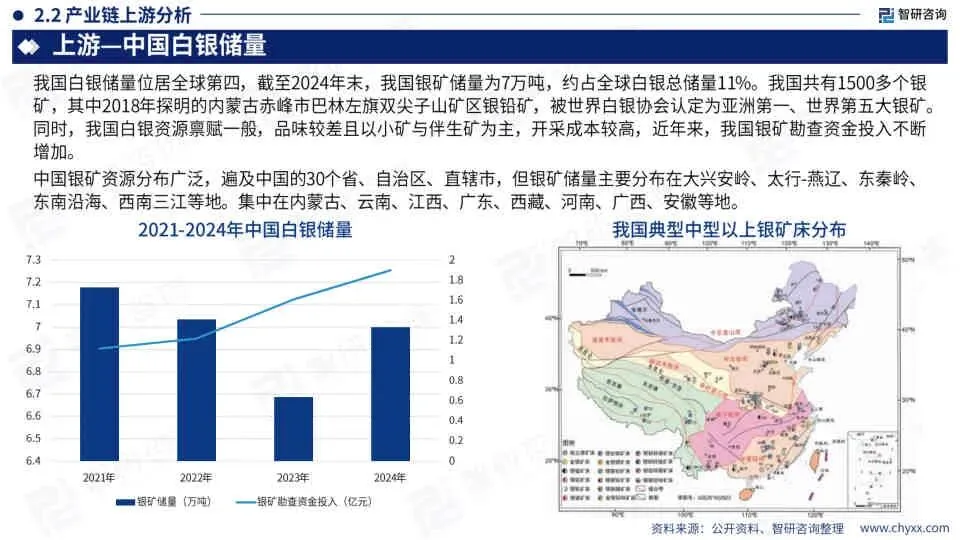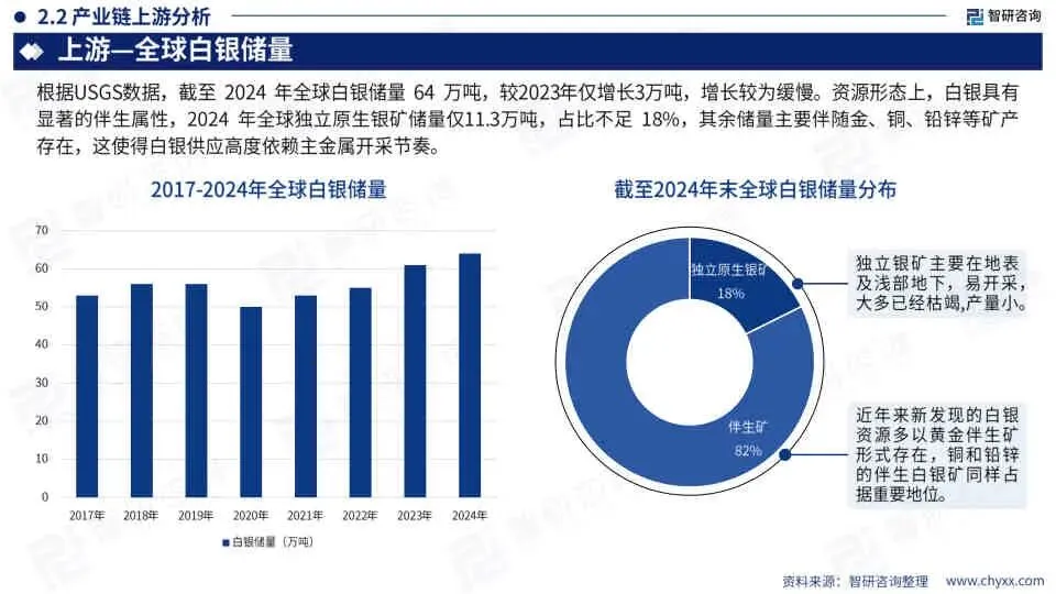 - 储量分布:全球白银储量增长缓慢,截至2024年约64万吨。中国储量7万吨,位居全球第四,但资源禀赋一般,以伴生矿(占70%以上)和小矿为主,开采成本高。