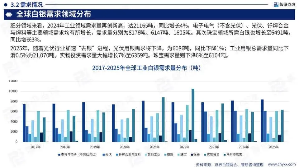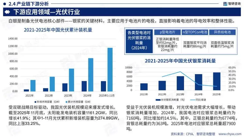 - 光伏:银浆是电池片电极的核心材料,2024年耗量约7160吨,2025年超7900吨。