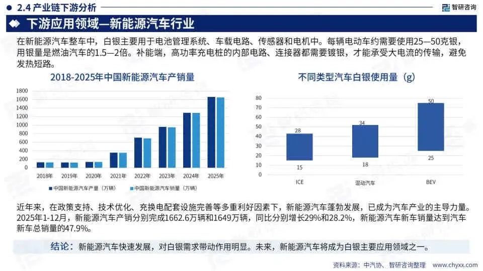 - 新能源汽车:单车用银量是燃油车的1.5-2倍(约25-50克),叠加充电桩需求,成为主要增长极。