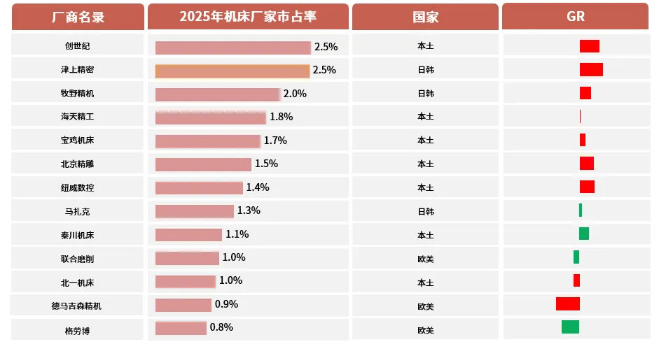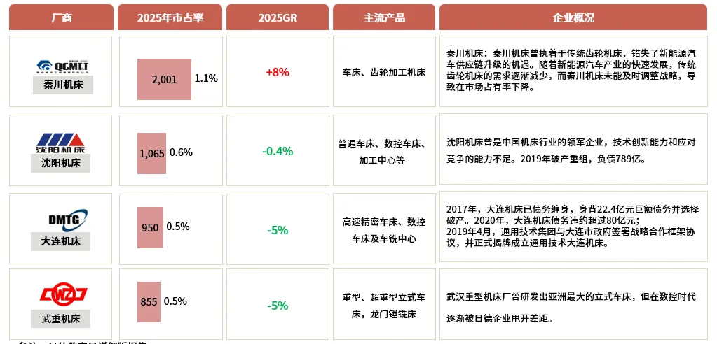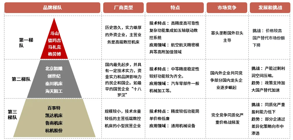 外资品牌主导高端数控产品,国内头部厂商国产替代加速,小型民营以价格优势扩大市场份额。