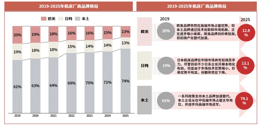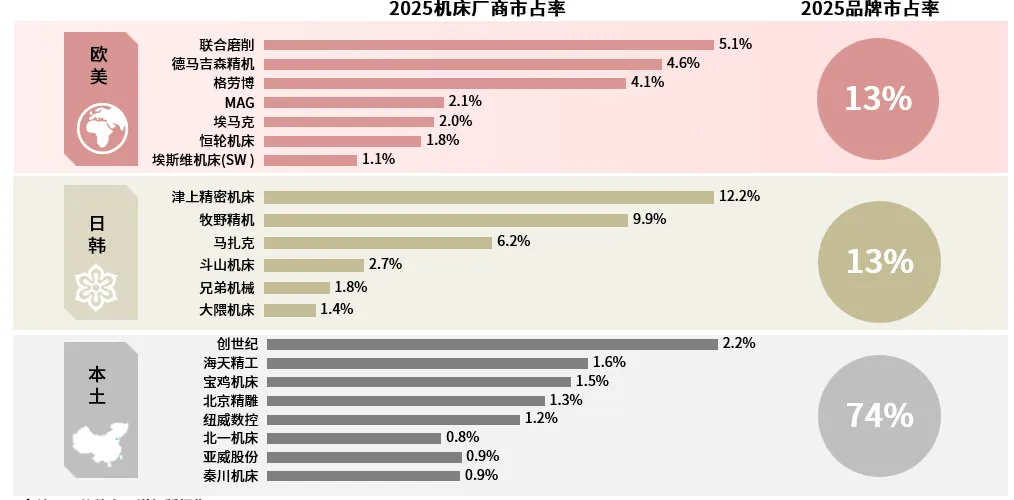 欧美日主导机床高端领域但份额在逐渐收缩,本土品牌通过价格优势和技术升级逐步进行国产化替代。